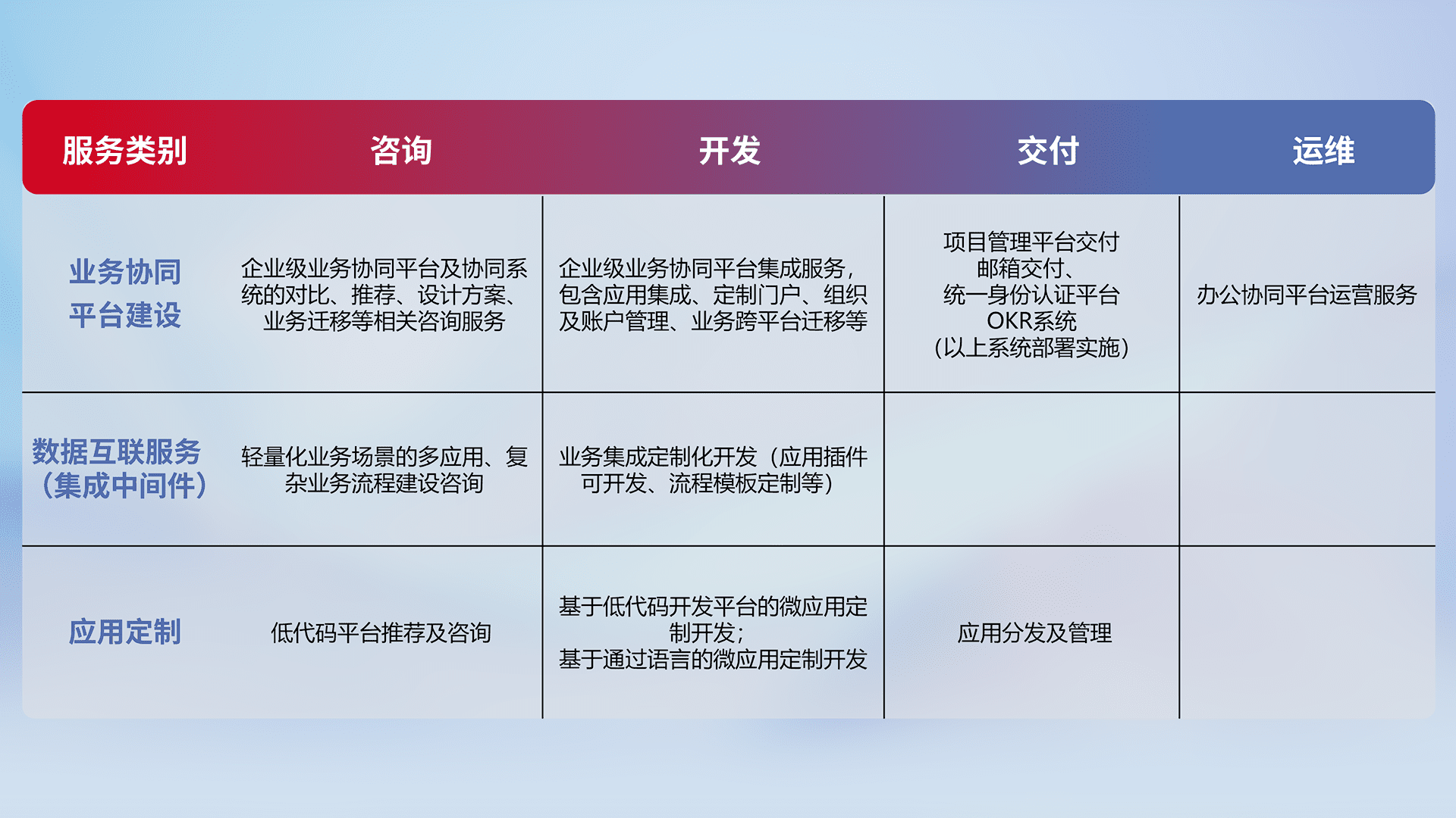 针对钉钉、、、企微、、、IDaas等平台级产品提供产品的规划、、、方案、、、交付、、、定制化开发等服务,,,实现如统一协同办公、、、、智能客户服务、、、、混合会议管理、、、、智能数据查询、、、等业务场景,,实现数字化转型。。。。