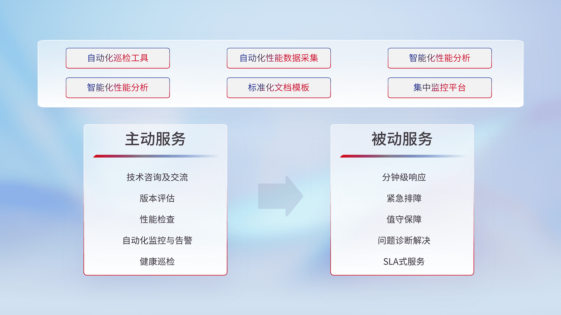 智能化工具和标准化文档,,保障服务质量,,,提供主动服务(包含技术咨询、、版本评估、、性能检查、、、自动化监控与告警、、、、健康巡检)和被动服务包含(分钟级响应、、、、紧急排障、、、值守保障、、、问题诊断解决、、、SLA服务)。。